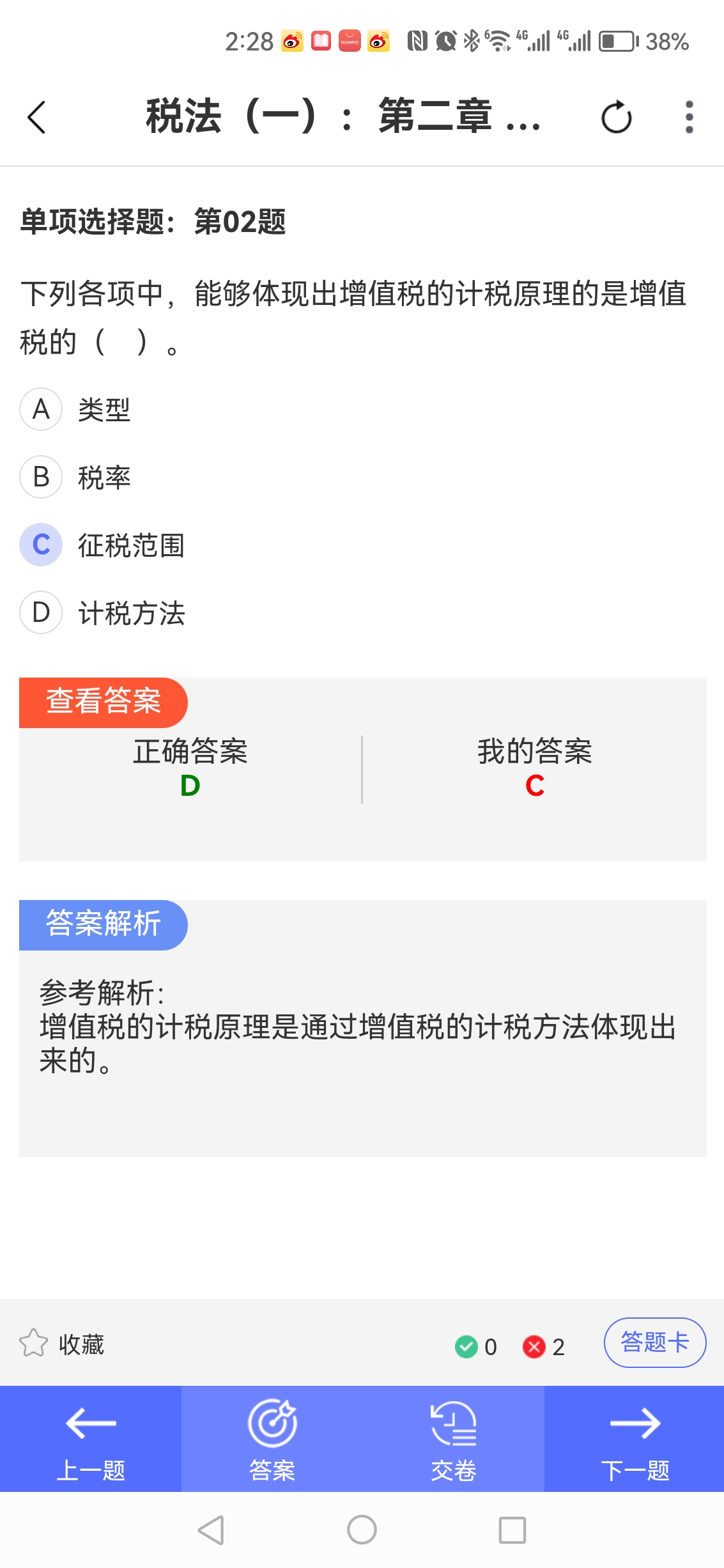 选项 D(计税方法):是 “增值额征税” 原理的直接落地方式(通过 “销项 - 进项” 或 “销售额 × 征收率”,实现对增值部分征税),因此体现计税原理。 选项 C(征税范围):是 “增值税管什么业务” 的范围界定,和 “怎么计算增值额的税” 无关,因此不体现计税原理。